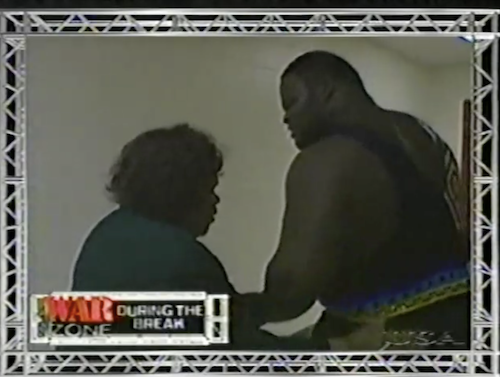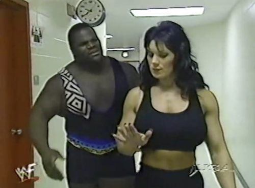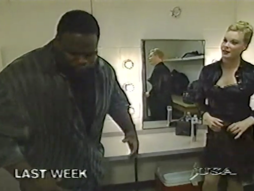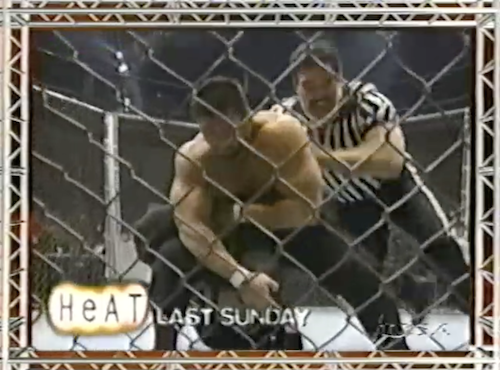 Replays air from last week’s WWF Raw, when Chyna and Sammy (italics in the original commentary, somehow) escorted Mark Henry backstage. In the ring, Chyna tells him his 24 hours are up, having given an ultimatum the previous night on Heat: Mark Henry has to “come clean” or else she’ll reveal some embarrassing secret. Crying, Henry admits that he and Chyna never did “the wild thing”, or even “the mild thing”.