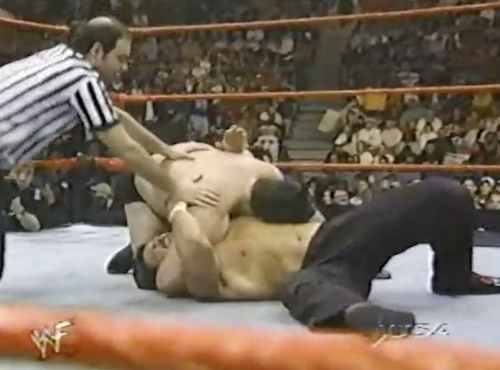 Dan Severn comes to the ring for his first match in months. Last week on Sunday Night Heat, Severn turned on Steve Blackman and took off his neck brace. Cole wonders whether the neck injury was a ruse the whole time. In fact, it was supposed to be a kayfabe injury but turned real when Owen Hart botched yet another inverted piledriver. So now Dan doesn’t even get credit for his real neck injury.