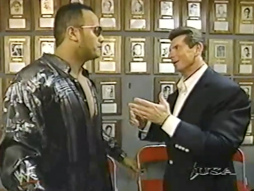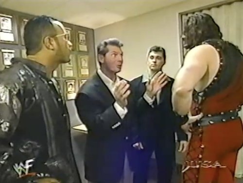 Backstage in the plaque room, Vince tells Rock not to worry about Kane tonight, even if he’s “a little ret**ded”. It will be “an easy smackdown”. The Rock is so confident Kane will play ball that he won’t even take off his $500 shirt. It’s a testament to WWF’s Creative that they always had fresh excuses for The Rock not to show his lipo scars.