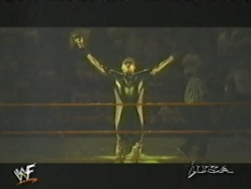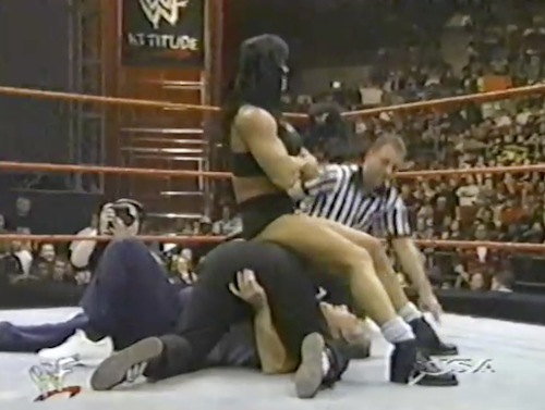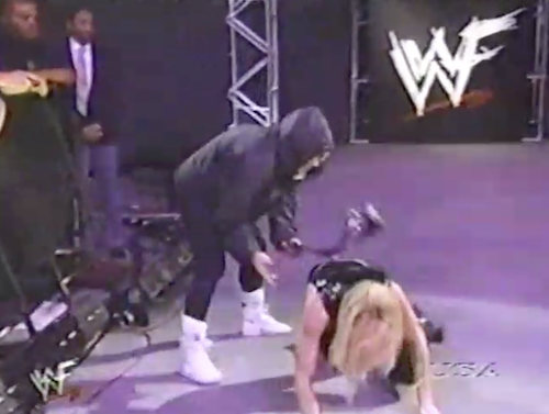 As the stooges bicker, Chyna takes a breather and sits on the top rope, so Patterson pushes her to the arena floor. DX is barred from interfering, so it’s Sable’s turn to make the save. Instead, she is immediately attacked with a strap by a hooded Luna Vachon. They’ll wrestle in a strap match at Royal Rumble.