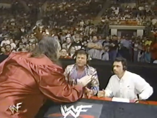 Road Dogg, who King says is hardcore because of his pierced “eyelid” (eyebrow), sets up a table in the ring. Gangrel takes advantage, though, and powerbombs Dogg through it. The champ kicks out and DDTs Gangrel (a Beautiful Maneuver) onto the remnants of the table. Roadie sets up another table outside the ring, but Gangrel assaults him with a piece of the other table before he gets to use it. King names Gangrel his favorite to win the Rumble (besides Vince McMahon).