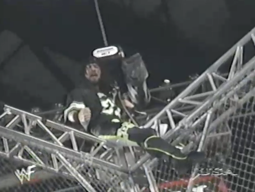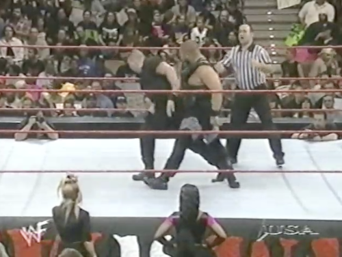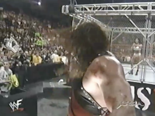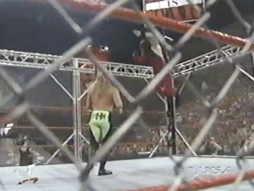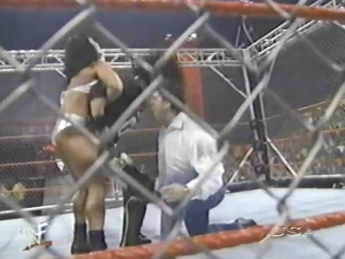 Shane takes off his jacket and throws a punch at X-Pac but gets taken down immediately. X-Pac motions for the Bronco Buster, but Chyna opens the cage door and trips her former ally. The two stare each other down before X-Pac kicks Shane and Chyna hits X-Pac downstairs. Chyna restrains X-Pac so Shane can slap and punch him. Vince said Shane had “testicles the size of grapefruits”, but King says they’re now the size of pomegranates.