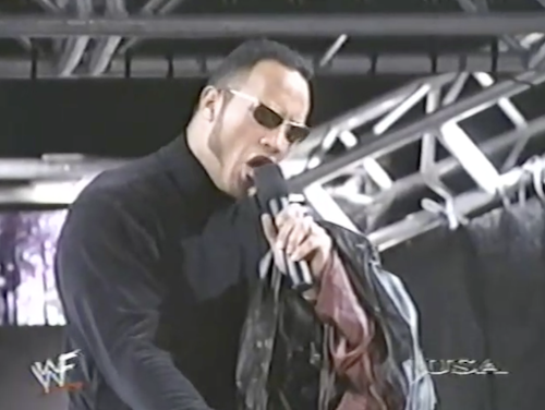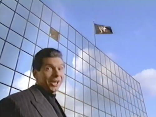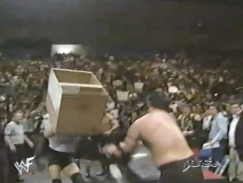 WWF Raw opens with clips of last night’s silly empty arena match, set to the epic strains of “Cold Sweat” (the stock music, not the James Brown tune). Vince McMahon says, “maneuver” multiple times in the intro alone, but because they’re from Halftime Heat and not WWF Raw, they don’t go towards his overall tally (which stands at 1037). In the end, Mankind used a forklift (with an invisible camera attached to it) to pin The Rock and regain the WWF title.