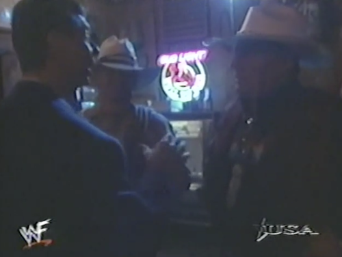 Vince is in a Victoria, TX bar with the stooges, who are dressed up in cowboy hats. McMahon’s mission is to provoke Steve Austin so that he’ll assault him and get fired. In the background plays a country tune which Shazam tells me is called, “Bars or Pub with a Few Patrons Drinking & Talking”. Great catch, Shazam, but not really what I’m looking for. Googling the lyrics doesn’t help. Anyway, Vince is rude to the bartender when she says she doesn’t “reckon” she’s seen Austin around. She ends up pulling a shotgun on Vince and company, who exit.