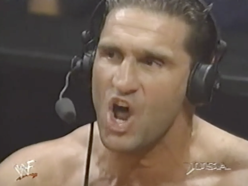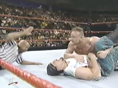 The match itself is just an excuse for Shamrock to get angry on commentary, and Lawler doesn’t help. The King, equal parts appalled and horny, recounts the things Venis did with Ryan Shamrock and eggs Ken on to get involved in the match. Sure enough, Ken hits Val in the back with a chair, causing a DQ. Technically, King points out, he didn’t lay a hand on Val Venis.