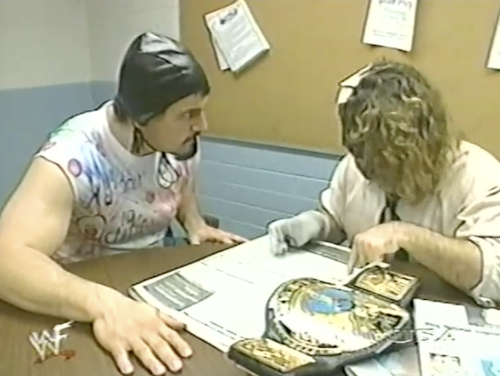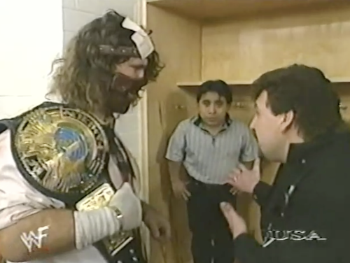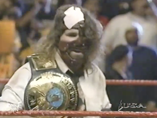 Mankind comes to the ring with the WWF title and bandages (over his mask). Foley won the title earlier that day before fans arrived, and just two days after he took way too many chairshots at Royal Rumble.
