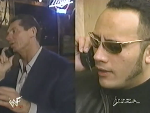 After the break, The Rock calls Vince, now in another bar, to complain about Mankind’s spending spree.