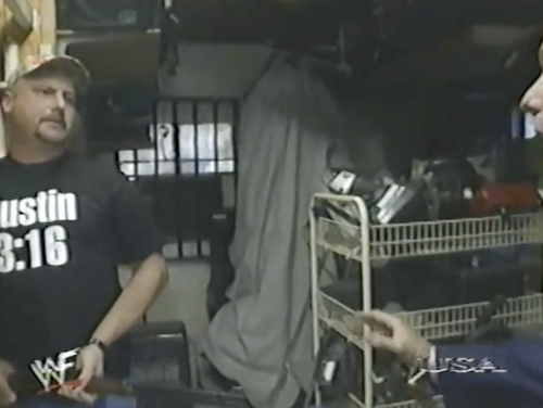 McMahon and the stooges believe they’ve found Steve Austin at a Victoria, Texas pawn shop. Vince tells Patterson & Brisco his plan to verbally provoke Austin until he attacks him physically. “And then from there”, he wants Pat and Gerald to jump Austin.