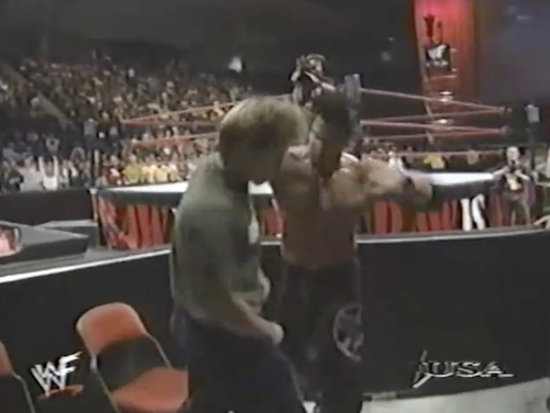 WWF Raw returns to find Road Dogg arguing with Al Snow over who abandoned whom in the match. Dogg says Snow left him to the Acolytes, while Al says Roadie didn’t back him up when he faced a “500-pound gorilla”. Road Dogg bashes him in the back with a chair, but if Snow is as dumb as Val Venis, he’ll probably blame Billy Gunn. The two men are scheduled to face each other at St. Valentine’s Day Massacre in the second of a best-of-three series.