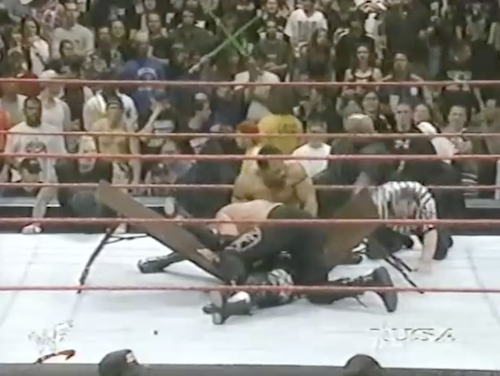 Road Dogg is out, wearing his Hardcore belt backwards, to do his mic schtick. At least this time, he remembers what title he has and that Billy Gunn isn’t there. Tonight, Roadie teams with Al Snow against the Acolytes. The action immediately spills to the outside, where Bradshaw chucks the timekeeper’s table at Al Snow. Road Dogg stabs Faarooq in the face with a pencil, while Bradshaw, having tossed the ring steps into the ring, unsuccessfully chucks them out of the ring onto Al Snow.