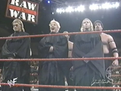 At Undertaker’s signal, the Ministry unmasks the druids as The Brood, who in their black robes look like they’re at the barber’s. It seems there can be only one spooky faction at a time in the WWF.