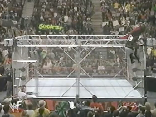 This time, Triple H tries to escape over the top and nearly gets chokeslammed off the top rope before crotching Kane on it. Hunter’s Pedigree attempt is reversed by Kane, who chokeslams him and finally tries to use the door. X-Pac, however, rushes down and slams it in Kane’s face. Kane and X-Pac punch it out at the top of the cage, while Triple H attempts to climb over the other side. Despite Chyna’s interference, Hunter makes it over and wins.