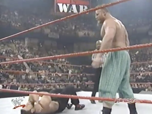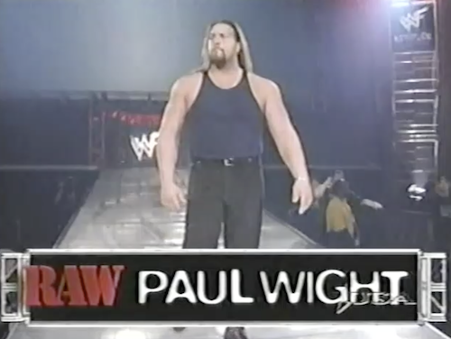 But The Rock, dressed as always in his warm-up gear, makes his entrance anyway. Upon Rock’s request, Paul Wight brings his roody-poo candy ass to the ring, accompanied by an indistinct theme with a heavy drum track. Vince McMahon, on commentary, is disconsolate.