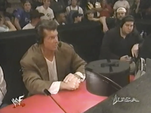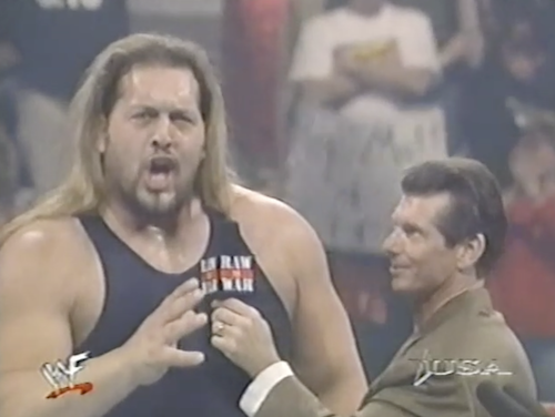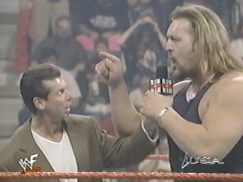 Mankind makes his entrance first. As a copyright notice appears on screen to signify WWF Raw is War’s transition to WWF WarZone, Vince McMahon strolls to the ring. He smugly tells Foley that the match is canceled, and that he should stick Mr. Socko where the sun don’t shine (which I believe is the Big Nasty).
