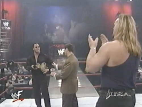 As Wight discusses his recent rampage through the WWF, Vince stands there holding the microphone with a genuine look of orgasmic joy over having such a big man in his employ. Paul Wight recounts throwing Stone Cold through a cage wall (neglecting that this won Austin the match), then holds up his hand and says that last week, Mankind felt “the Big Nasty”. I shudder to think what he means by that.