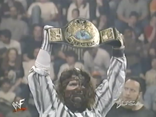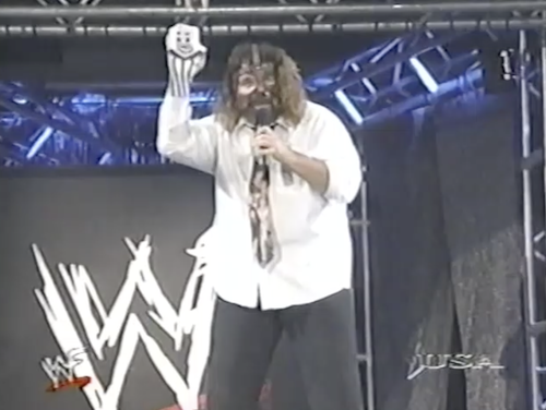 Just then, Mankind’s music hits. Foley, who last night started a petition to be a second guest referee at WrestleMania, has drawn stripes on Mr. Socko. As an audition, he suggests he referee a match between Paul Wight and The Rock for the title later tonight on WWF Raw. Both competitors agree, to Vince McMahon’s dismay.