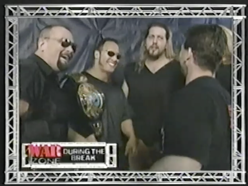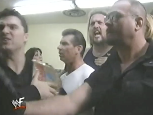 WWF Raw returns with a shot of an intra-Corporate argument. In a crowded dressing room, members of the Corporation separate Rock and Big Nasty.