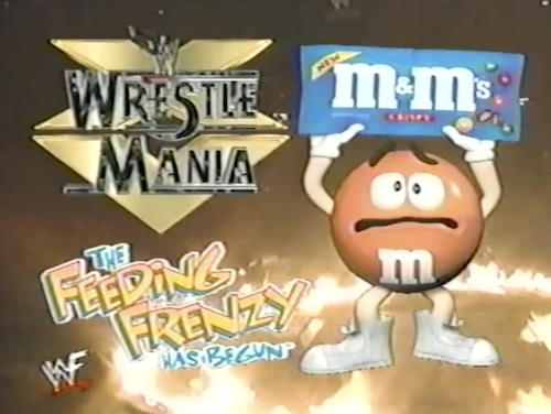WrestleMania XV is brought to you by M&Ms, whose mascot appears to be burning in a circle of fire.