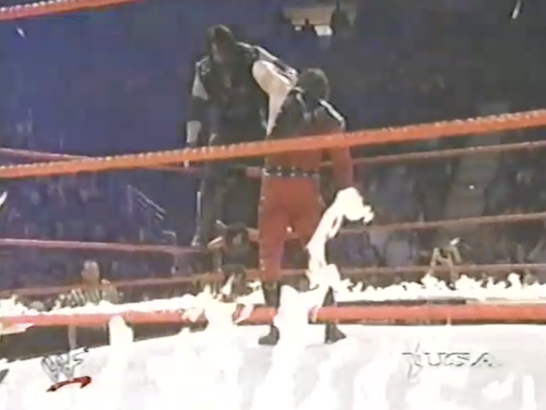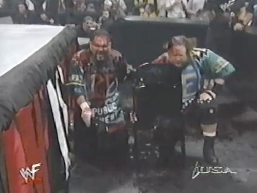 Gangrel drinks his customary red liquid before the Brood’s match tonight against Public Enemy, who are making their WWF debut. Public Enemy hits the Brood with “double-team maneuvers” like the flapjack. After another Double-Team Maneuver (the Tower of Quebec) on Gangrel, Christian interferes to end the match by DQ. The teams brawl until Public Enemy take a powder and reach for some chairs, at which point the lights go out. When the lights come back on, they’ve been blood-bathed.