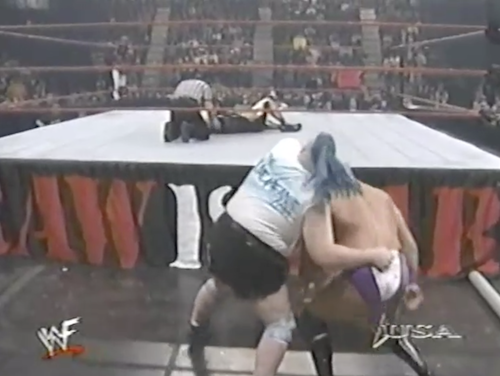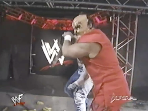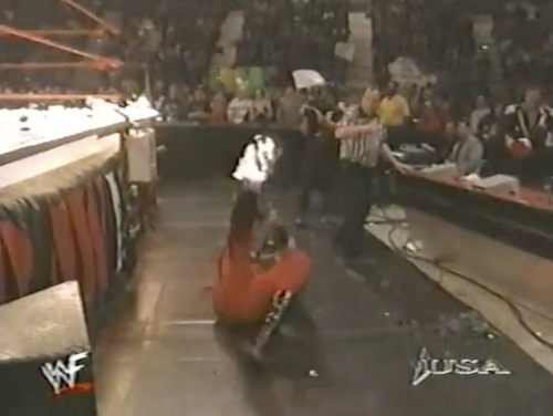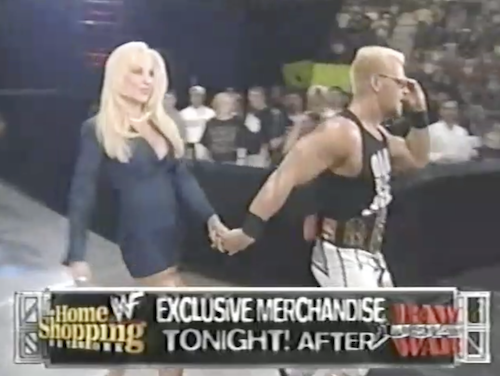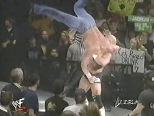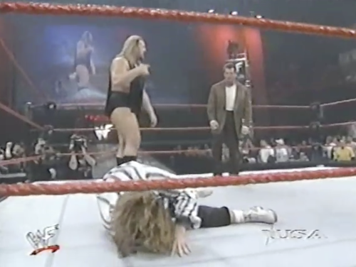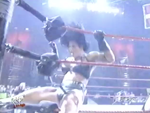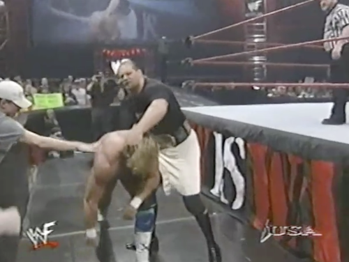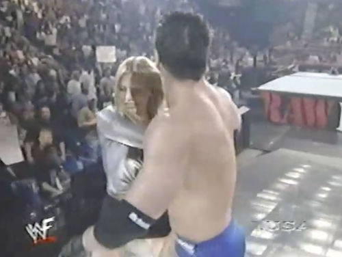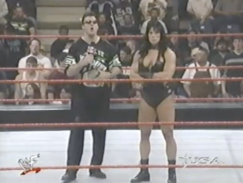 WWF Raw returns from this shocking turn of events to present Chyna vs. X-Pac. Shane McMahon, wearing a homemade “X-Punk” jersey, accompanies Chyna and cuts a promo. Note that this “X-Punk” jersey is different from the “X-Chump” shirt he was wearing twenty minutes ago. On the mic, Shane can’t decide which is the better insult.