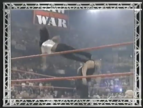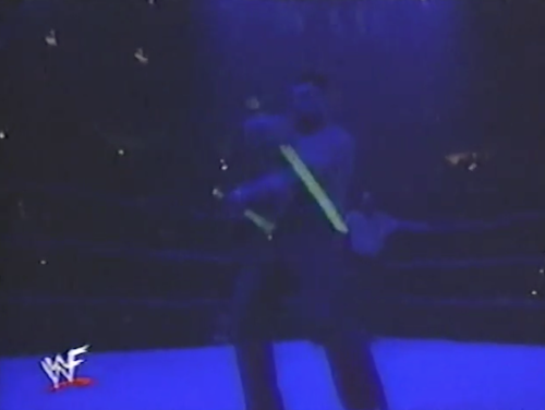 Michael Cole notes that the men “are up fifteen feet high on that steel stage”, which suggests a) Cole is a lousy judge of height, and b) someone is going to fall off it. Bart hits Holly with a sack of flour but gets ambushed by a large Steve Williams-sized man in a kabuki mask. The masked man chucks Bart through a table on the floor, waves his arms karate-ily, and walks off, never to be seen again. Holly then descends six feet via the stairs and pins Gunn to retain the title.