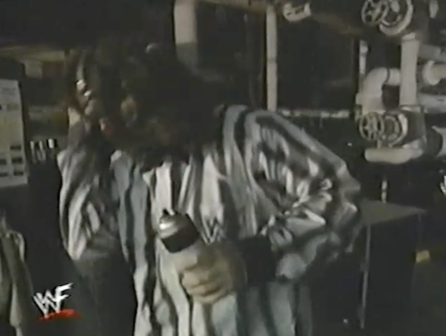 In the boiler room, Mankind spray-paints zebra stripes for his refereeing gig.