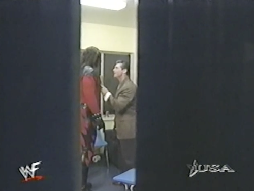 Just like last week on WWF Raw, Sable is here to talk with Kevin Kelly. Kelly notes Sable’s change in attitude, but Sable steers the conversation towards her appearance on Regis & Kathie Lee. She then points out her stalker in the crowd, inviting her into the ring. Sable asks her name (Tori) and asks her to share what she likes about Sable. The soft-spoken Tori praises her grace, beauty, and power, but Sable calls her pathetic and a skank.