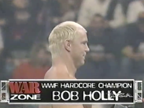 Hardcore Holly, as Bob is now sometimes called, defends his Hardcore title against Bart Gunn tonight. The Brawl For All champion arrives in his old Smoking Gunns attire (jeans) and punches Bob until he retreats. Holly turns things around quickly by smashing Bart in the head with a glass pitcher of Kool-Aid and a steel chair, so Bart evens things up with a mug and the ring bell.