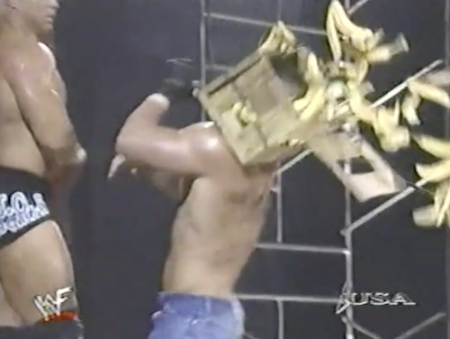 Both men fight up the stage, where Bart finds a watermelon and hits Holly over the head with it. The fruit fight continues when Holly hits Gunn in the grapefruits and smashes a crate of bananas over his head. The Hardcore champ continues his assault with a trash can. Hey, you can’t eat that! Unless you refuse to put on these glasses.