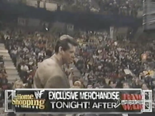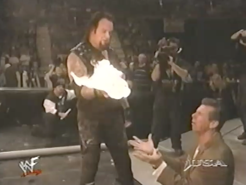 It’s main event time on WWF Raw. Vince McMahon heads to the ring, where he promises Undertaker’s flesh will burn in an inferno. “This will not be for the weak of stomach”, says Michael Cole for about the tenth time tonight. Once someone is set on fire, the match is over, and fans can go to the Home Shopping Network for great deals on WWF merchandise.