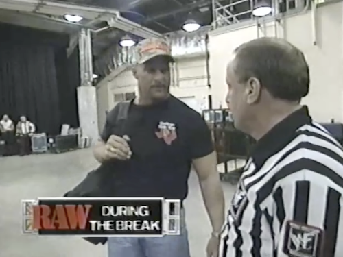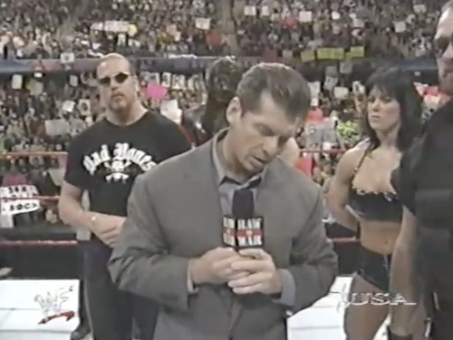 WWF Raw returns with footage from the break. As Steve Austin enters the arena, Earl Hebner warns him that he is set to face Kane tonight. To this, Stone Cold says he’s already in the WrestleMania main event, so he doesn’t really care his opponent. Nor, as fans no doubt realize, does it matter much whether he wins or loses.