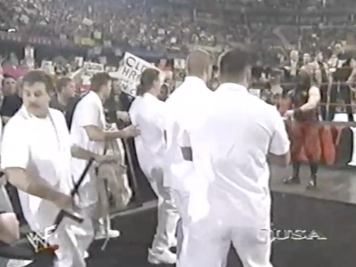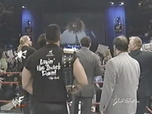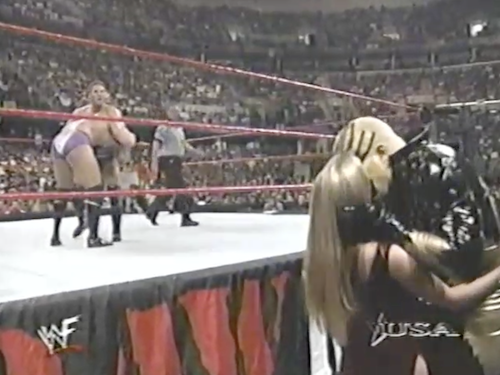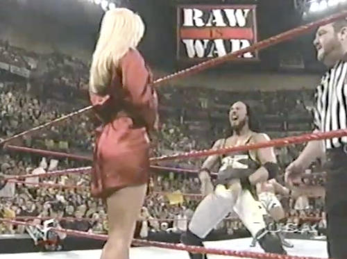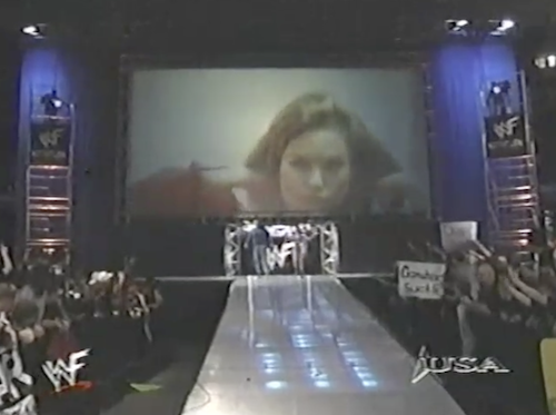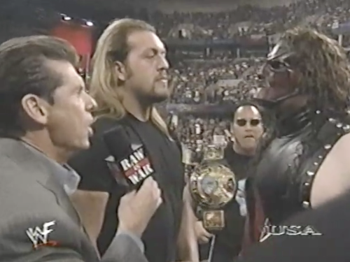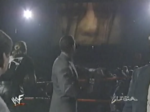 In the dressing room, Chyna tells Kane he has to win, or else they’re “both out of a job”, implying they’ll both be fired from the WWF altogether. On the other hand, Michael Cole has been saying all night that they’ll merely be fired from the Corporation (though Kane would find it hard to continue his wrestling career while locked up in a sanitarium).