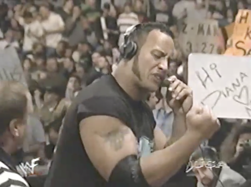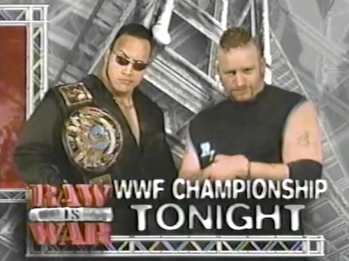 The Road Dogg comes to the ring for his WWF title match, noting a 4/20 sign in the crowd. But it’s only March 1st—how embarrassing for that fan! The Rock comes out, promising to kick Road Dogg’s roody-poo candy ass; he’d better, or else Steve Austin is going to wrestle Road Dogg in the main event. The Rock indeed delivers a roody-poo candy ass-kicking, but it’s not enough for him; he brings Paul Wight to ringside for insurance.
