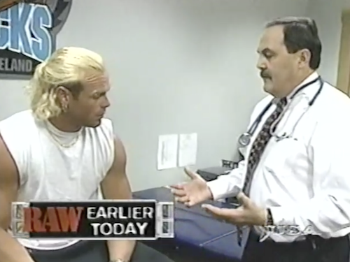 In more footage, this time recorded before WWF Raw, Billy Gunn is told he has fluid in his lungs and is “on the verge of an asthma attack”. He is therefore not cleared to wrestle tonight, meaning he can’t wrestle for the Intercontinental title. For that reason, Goldust is in the Triple Threat tonight. Does that mean Billy will get to challenge Road Dogg for his WWF title next week?