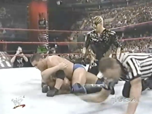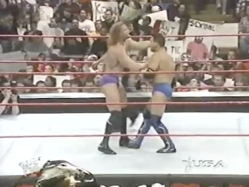 Shamrock has Val Venis in a front facelock but loses his concentration when he spots Goldust embracing his sister. Goldust kisses Ryan, sending Ken into a rage (a WrestleMania rage, perhaps). As Ken fights with Goldust in the crowd, the referee counts both men out and awards the match to Val. While jarring to today’s viewers, at least this Triple Threat finish isn’t nearly as stupid as when The Rock retained his IC title by walking out.