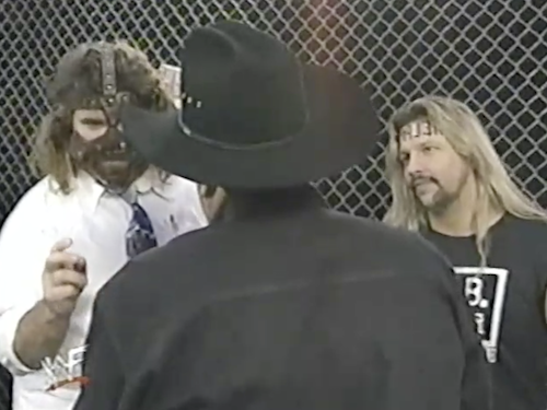 Backstage, Mankind and Al Snow speak with a figure in a black cowboy hat. His identity is no mystery, of course; Michael tells us Jim Ross is finally returning to WWF Raw after his latest bout of Bell’s palsy. No, the real mystery being subtly teased is what his face looks like now.
