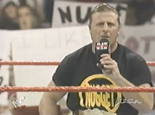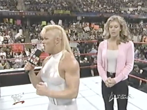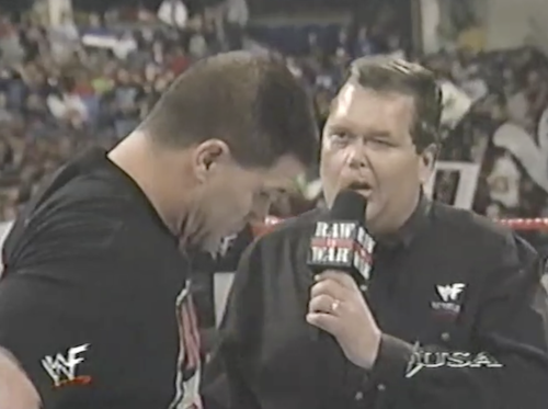 Jim Ross returns to WWF Raw after a long recovery from Bell’s palsy to interview Bart Gunn. It’s like an inspirational movie! Bart says he’s training to not just beat Butterbean, but to knock him out. Ross then scolds Bart for not looking at his face before launching into a list of grievances about the WWF not letting him back on the air. Next, he tears into Gunn for bragging about knocking out “JR’s boy” Steve Williams, then yells at him to show him some respect and look him in the face. The crowd cheers, which is probably not the intended reaction. Ross slaps Bart, resulting in some “oooooh”s.