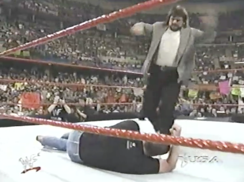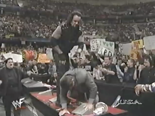 McMahon and Undertaker stare each other down as Mankind makes his entrance. As Foley and Taker duke it out, Vince clarifies that if Mankind wins tonight, he will be the second referee at WrestleMania. Since he’s busy explaining the storylines, he has no time to call any maneuvers.
