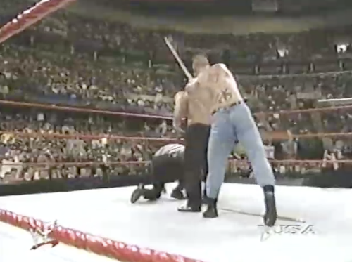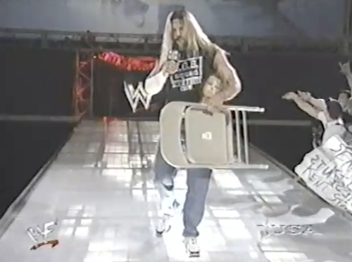 Before Road Dogg can leave the ring, Al Snow comes down with Head and a chair, introducing himself like a game show contestant. Snow wants to continue his series with Road Dogg, to which Dogg assents via a chair shot to Snow’s head (that is, his skull). Bob Holly then steps in and immediately eats a chair shot to the head. Dogg then challenges the “two pussies” to a fight in the parking lot.
