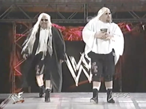 Now outnumbered, Triple H is picked apart by the champions. This double-teaming leads the referee to throw the match out just one second before X-Pac returns to clean house. Outside the ring, Ivory very slowly pursues Debra (Both women are wearing high heels). At the top of the ramp, D’Lo Brown appears, takes out both tag champions, and cuts off Debra’s escape. This allows ivory to take off Debra’s robe. “Bra and panties!” yells Lawler as the champs cover Debra up with their belts.