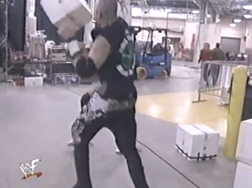 Backstage, Bob Holly fights with Road Dogg, who hits him with a box-like structure.
