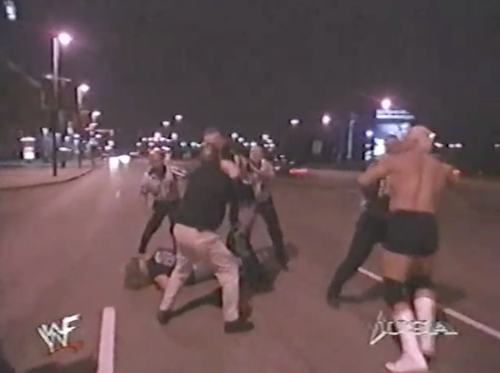 When WWF Raw returns, the brawl is still going on. The men hit each other with pallets and trash cans. A freight elevator door opens, but everyone ignores this.