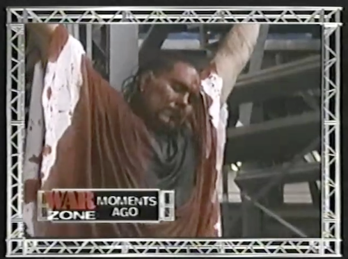 During WWF Raw’s commercial break, Johnny Grunge found Flyboy Rocco crucified—uh, hanging high off the ground with his arms spread apart—and covered in blood.