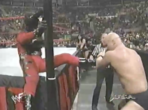 As Stone Cold works over Kane, Michael Cole reminds us that there is nothing at stake for Austin tonight. Kane sends Austin briefly out of the ring, giving the Big Red Machine a chance to fasten his boot. The match devolves into the standard Stone Cold brawl around the ring and in the crowd. At one point, Chyna clocks Austin, but Kane intervenes before Stone Cold can retaliate. Later, she gives Austin the Tony Atlas Special with her high-heeled boot.