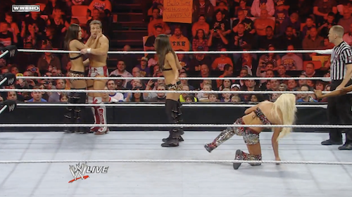 Of course, this being the PG Era, they couldn’t say virgin or virginity or deflower or sex or screw or bonk or boink. Instead, the Bella Twins wagered on whose “charms” Bryan would “succumb to”. WWE’s Youtube called it a bet over “Daniel Bryan’s affection”.