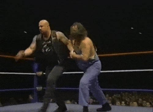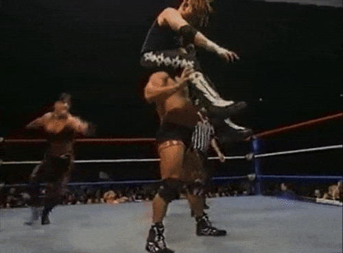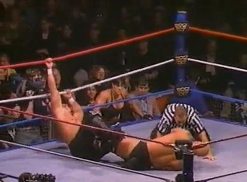 The anomalies continue in the Goldust-Cactus Jack match, where Jack somehow reverses this sunset flip into a chin lock: