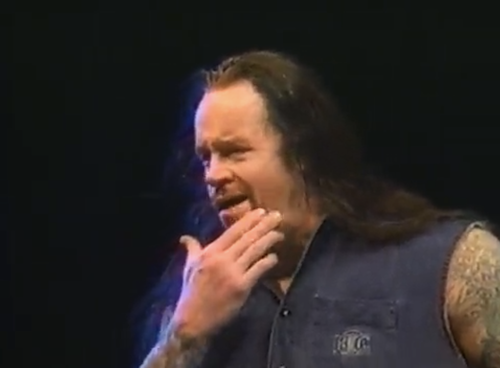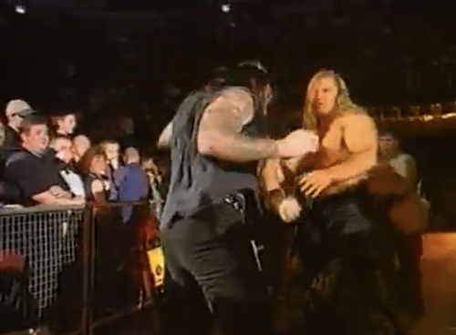 Tonight, though, there is no elaborate entrance for Taker. Hell, there isn’t any entrance for Taker, whose Lord of Darkness gear got mixed up in baggage. Rather than try to summon the supernatural in his street clothes, Taker gets jumped by DX out of literally nowhere.