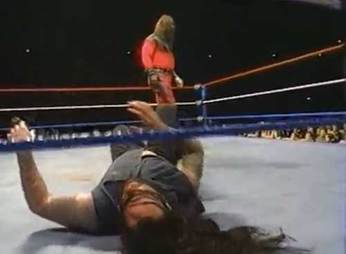 Then, just to see how much they can get away with, the WWF not only cuts the rest of the night’s bouts to a tiny fraction of their original length, but pretends they’re the full matches. Michael Cole and Kevin Kelly provide commentary as if they’re watching the matches live, despite the many obvious edits.