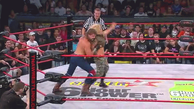 The match starts and Deaner attempts to intimidate ODB by showing her his King of the Knockouts t-shirt. She counters that by grabbing it and flossing her nether regions with it. Undeterred Cody turns his hat around, which ODB promptly rips off his head and does the same with that too. “It’s Sunday night in the double wide!” exclaims Taz’s co-hort Mike Tenay.