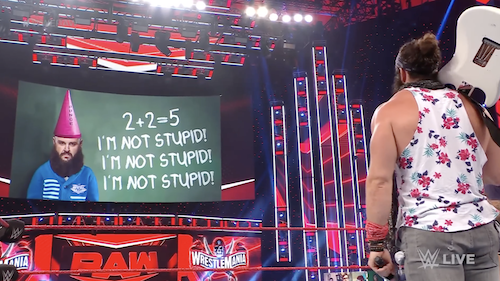 …Shane showed off a Photoshop of a young Braun Strowman in a dunce cap and “2+2=5” written on the chalkboard.